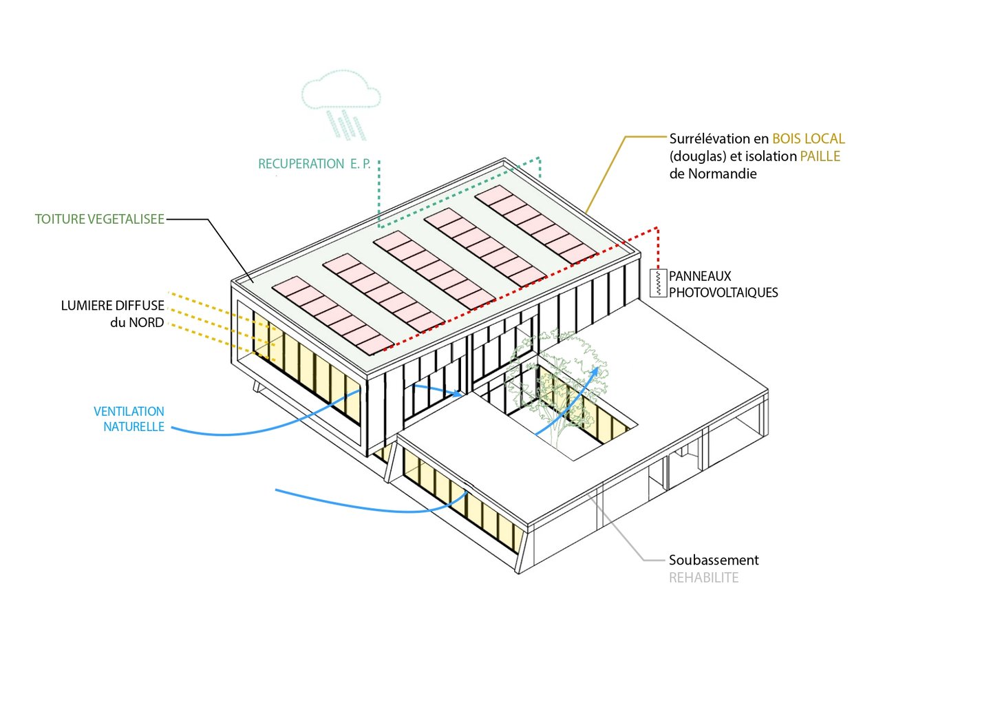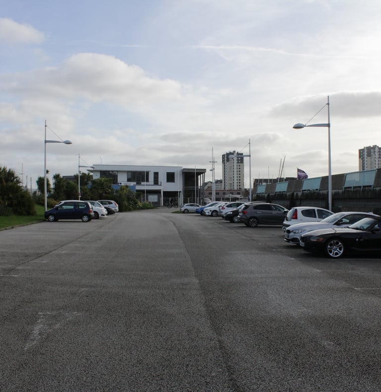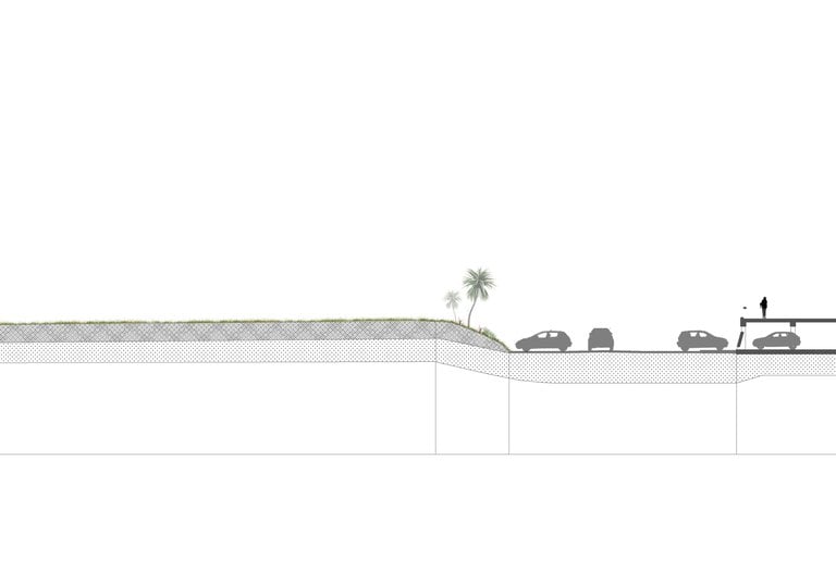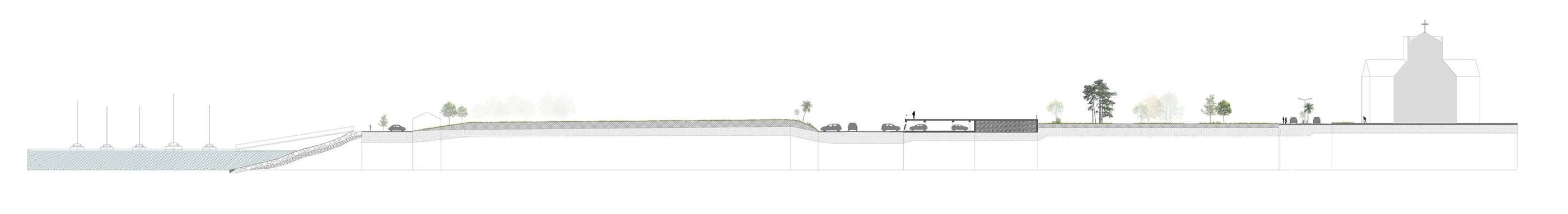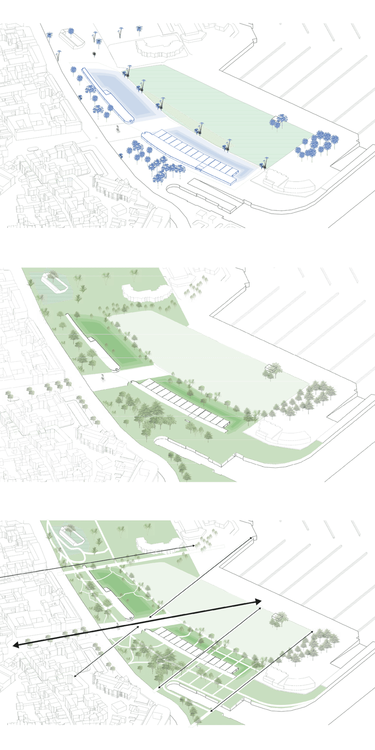 Le parking adossé aux murs anti-chars est réhabilité et surélevé. Sa trame structurelle devient le support de nouveaux équipements destinés à renforcer l’attractivité du site : une ludothèque, des espaces de restauration, un fablab, des espaces de travail partagés ainsi qu’une école préparatoire dédiée à l’énergie et à l’environnement. L’ensemble de cette programmation crée des polarités le long de la coulée verte, en résonance à la fois avec la ville et son littoral.