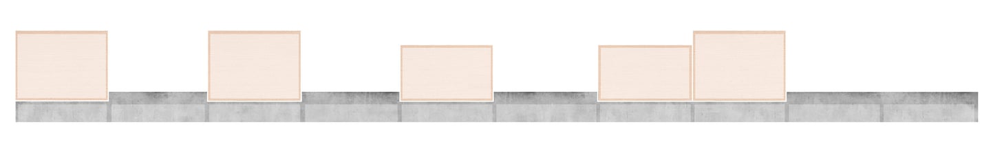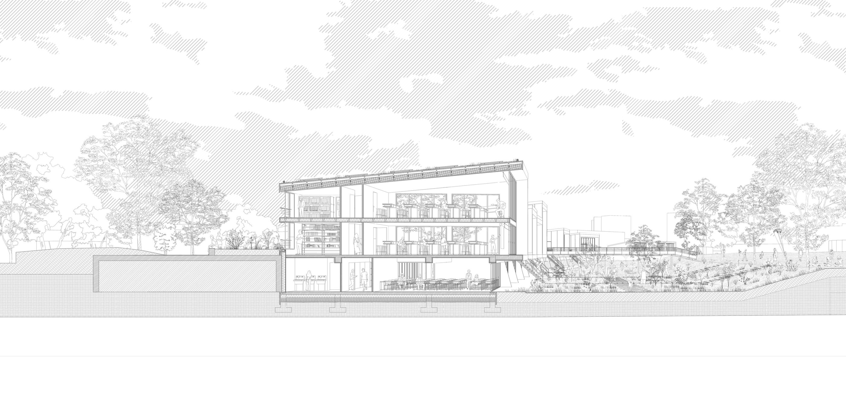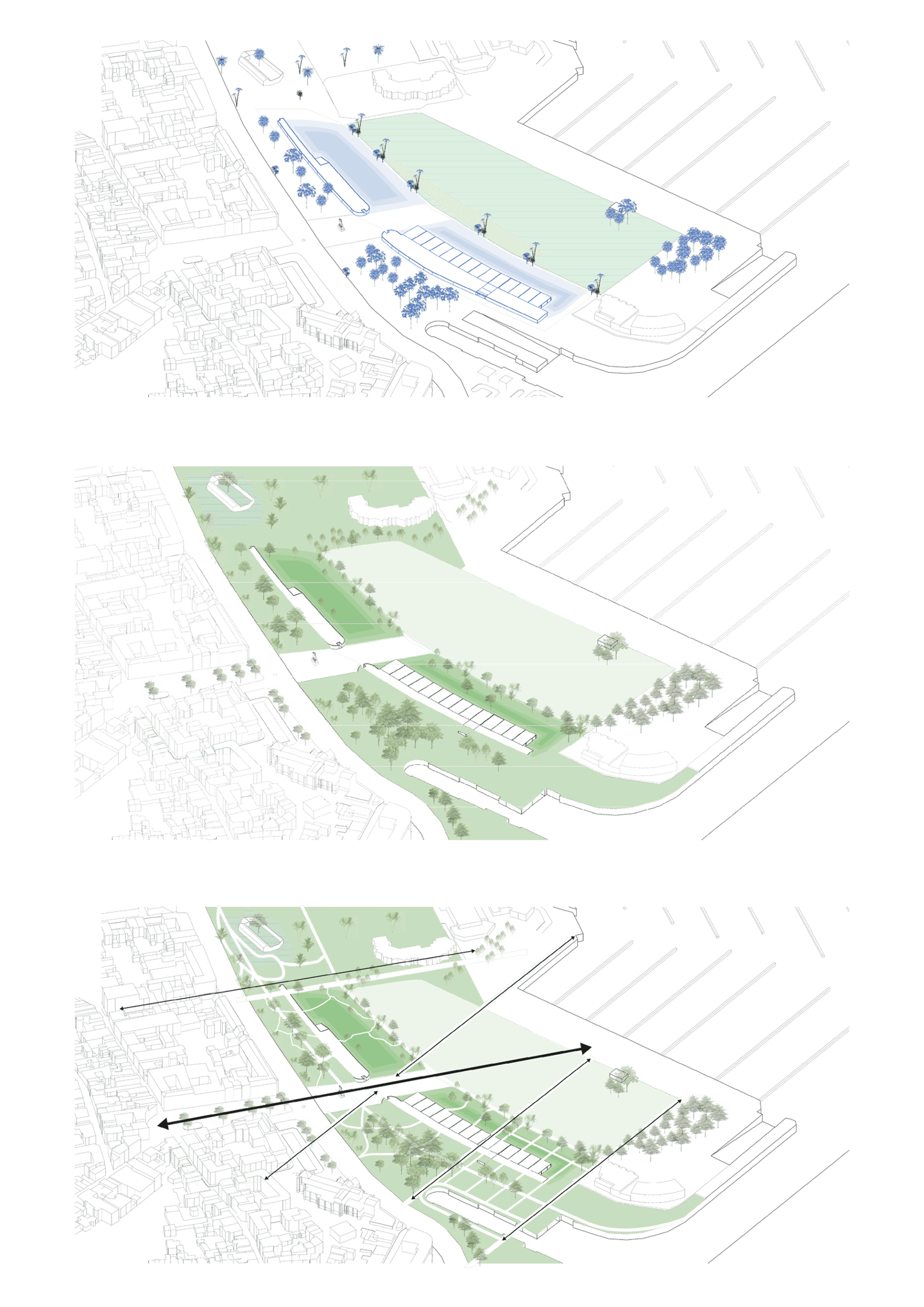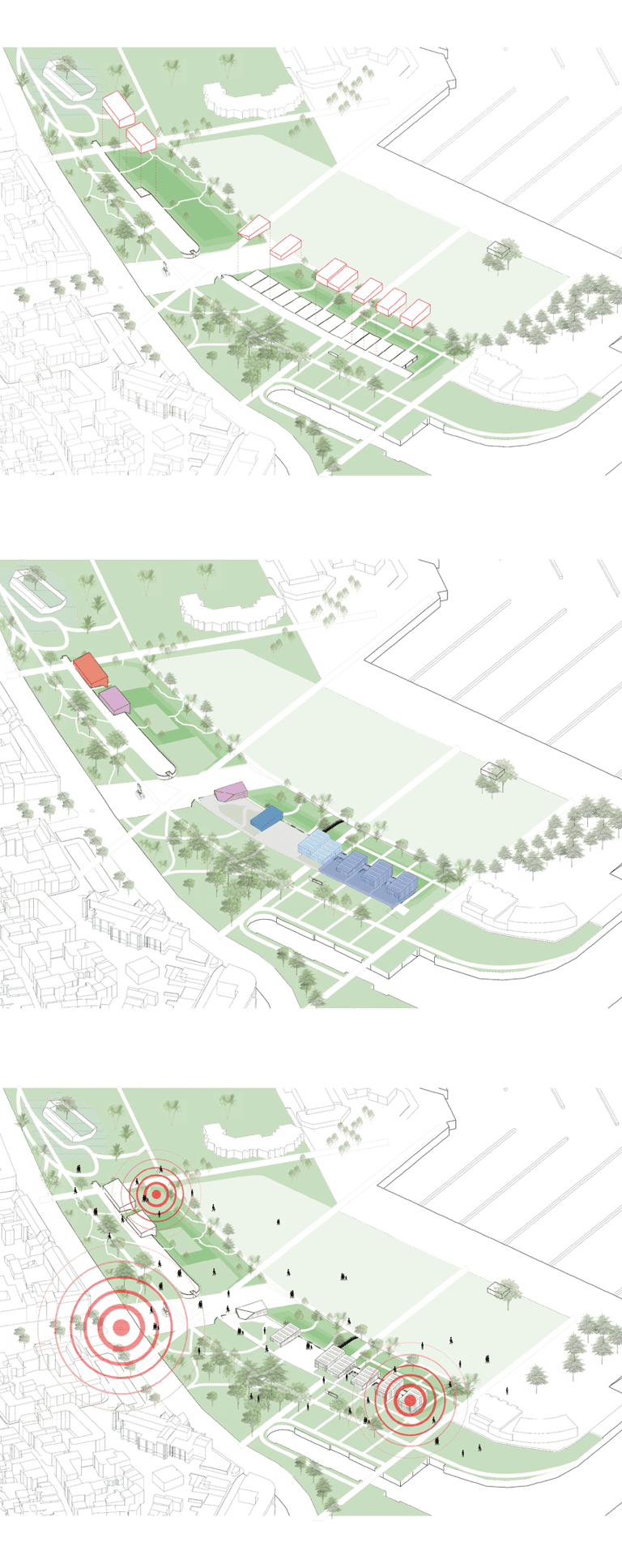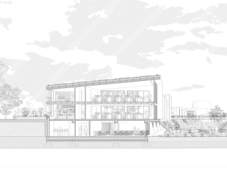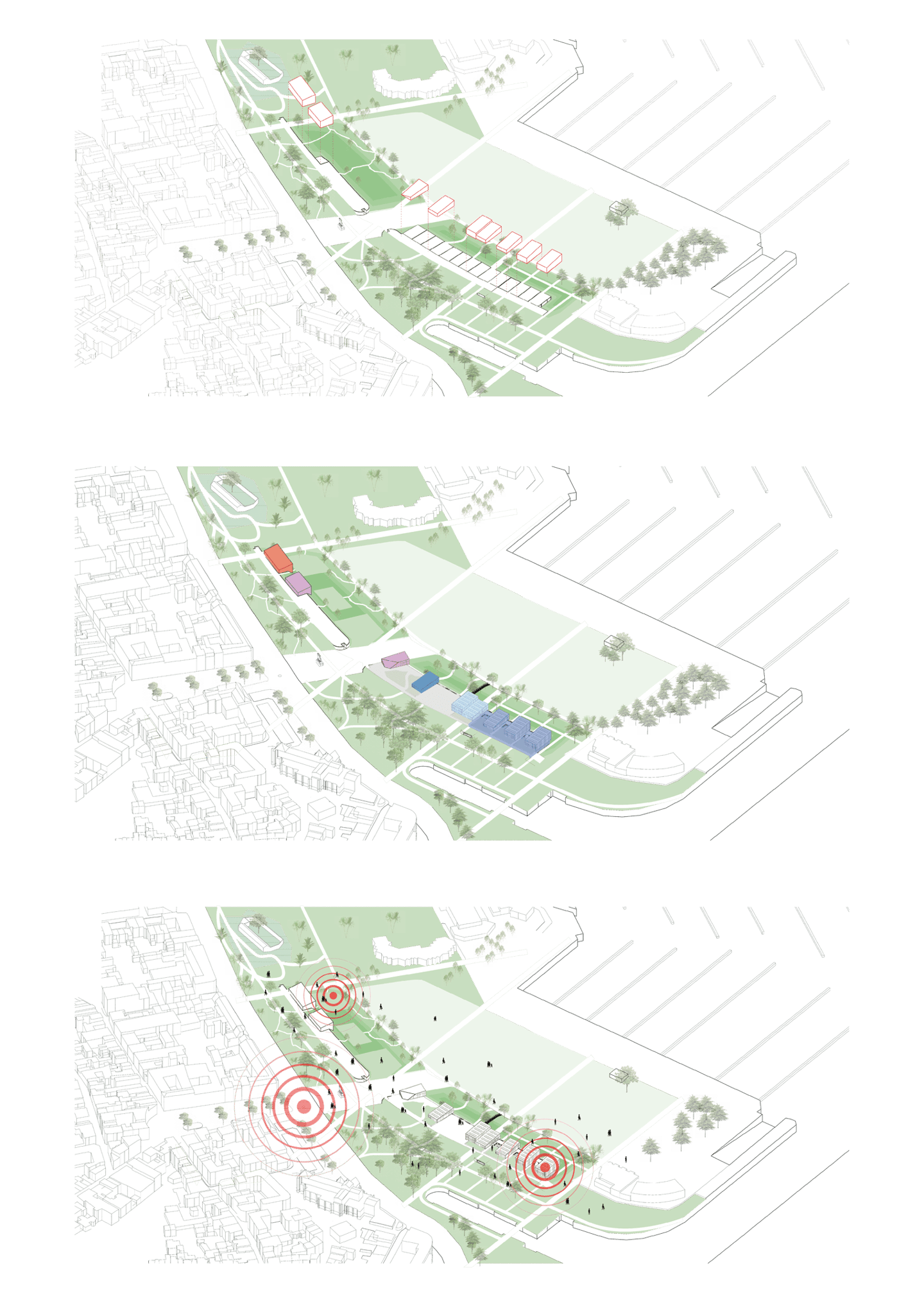 Le parking adossé aux murs anti-chars est réhabilité et surélevé. Sa trame structurelle devient le support de nouveaux équipements destinés à renforcer l’attractivité du site : une ludothèque, des espaces de restauration, un fablab, des espaces de travail partagés ainsi qu’une école préparatoire dédiée à l’énergie et à l’environnement. L’ensemble de cette programmation crée des polarités le long de la coulée verte, en résonance à la fois avec la ville et son littoral.