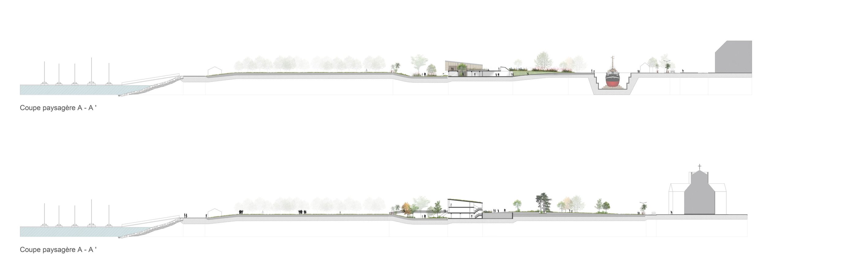 La végétation existante est conservée et valorisée au sein d’un parc structuré autour de thématiques liées à l’histoire botanique de la ville : une flore tropicale importée du Brésil, la flore des dunes normandes, un jardin à l’anglaise composé exclusivement des arbres existants, ainsi qu’une trame de parterres de fleurs endémiques du Cotentin. Une pente douce relie cette nouvelle ceinture verte à la ville et intègre au parc les murs anti-chars, aujourd’hui perçus comme des barrières, en les transformant en éléments structurants du paysage.